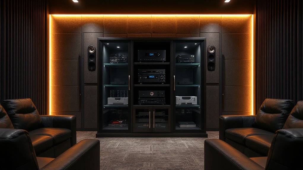 Think of a home theater rack as a fortress for your equipment. Most models come with lockable doors, padlock provisions, and secure handles to safeguard your gear. Some even feature electronic locks or security alarms for added protection. I recommend choosing a rack with robust locking mechanisms and tamper-proof construction to keep your equipment safe from theft or accidental damage, ensuring peace of mind during movie nights.