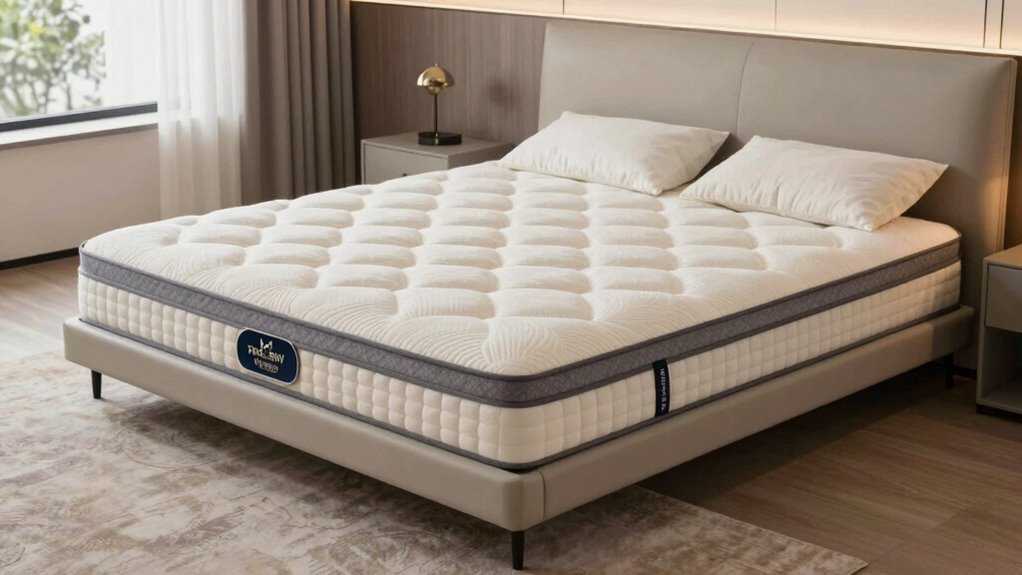 Edge support strength plays a vital role in ensuring your king hybrid mattress remains stable and comfortable, especially along the perimeter where you often get in and out of bed. Strong edge support prevents sagging and maintains shape, maximizing your usable sleep surface. Reinforced edge springs or coils help keep the mattress firm and prevent roll-off, even during sitting or when you sleep close to the edge. This support also makes it easier to get in and out of bed without risking damage over time. Additionally, solid edge reinforcement distributes weight evenly across the surface, reducing pressure points and boosting comfort. Overall, good edge support is essential for long-term durability, ensuring your mattress maintains its shape and performance for years to come.