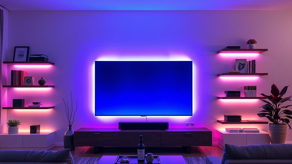 Imagine your TV glowing softly, creating a cozy, immersive atmosphere. Are LED backlights safe for all screen types and sizes? I’ve found that most LED kits are designed to be safe when installed correctly, without touching or overheating the screen. However, I always recommend checking compatibility and following manufacturer instructions closely, especially for delicate or larger screens, to guarantee safety and peak performance.