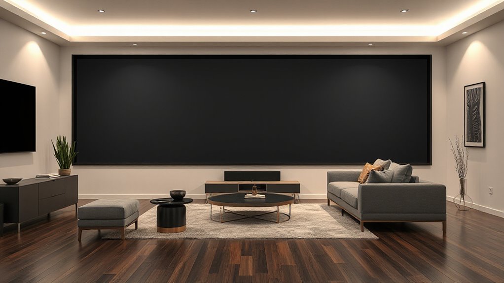 The quality of your projection surface plays a crucial role in delivering sharp, vibrant images on a 150-inch screen. A smooth, uniform texture guarantees consistent clarity and accurate colors, making your viewing experience more immersive. Surfaces like MaxWhite, MaxWhite 2, or fiberglass-backed options are popular because they offer high gain, wide viewing angles, and excellent contrast. The gain rating, usually between 1.1 and 1.2, affects brightness and viewing angles; higher gain boosts brightness but narrows the angle. A fully black-backed surface prevents light penetration, improving contrast especially in dark rooms. Additionally, certified surfaces like ISF or Greenguard assure color fidelity, environmental safety, and low emissions, ensuring a high-quality, reliable projection surface for your setup.