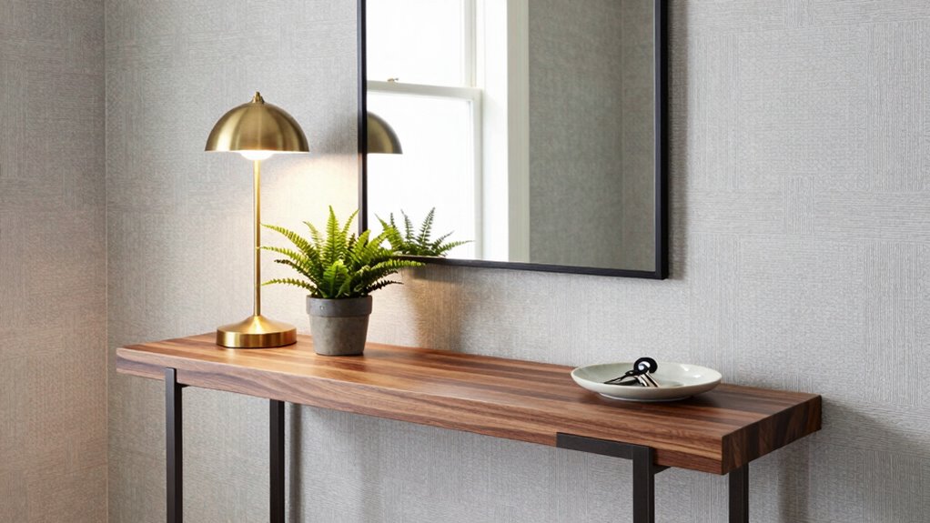 Ensuring your narrow console table fits perfectly in your entryway starts with measuring the available space carefully. I always check the length, width, and height of the area to make sure the table isn’t too bulky or too small. It’s important to leave enough clearance around the table—at least a few inches on each side—to allow easy movement and prevent congestion. I also consider the door swing and nearby furniture to avoid obstructing pathways or access points. Additionally, I think about storage needs—whether I want space for keys, mail, or decorative accents—and choose dimensions accordingly. Taking all these factors into account ensures the table complements the space without crowding it, making your entryway both functional and inviting.