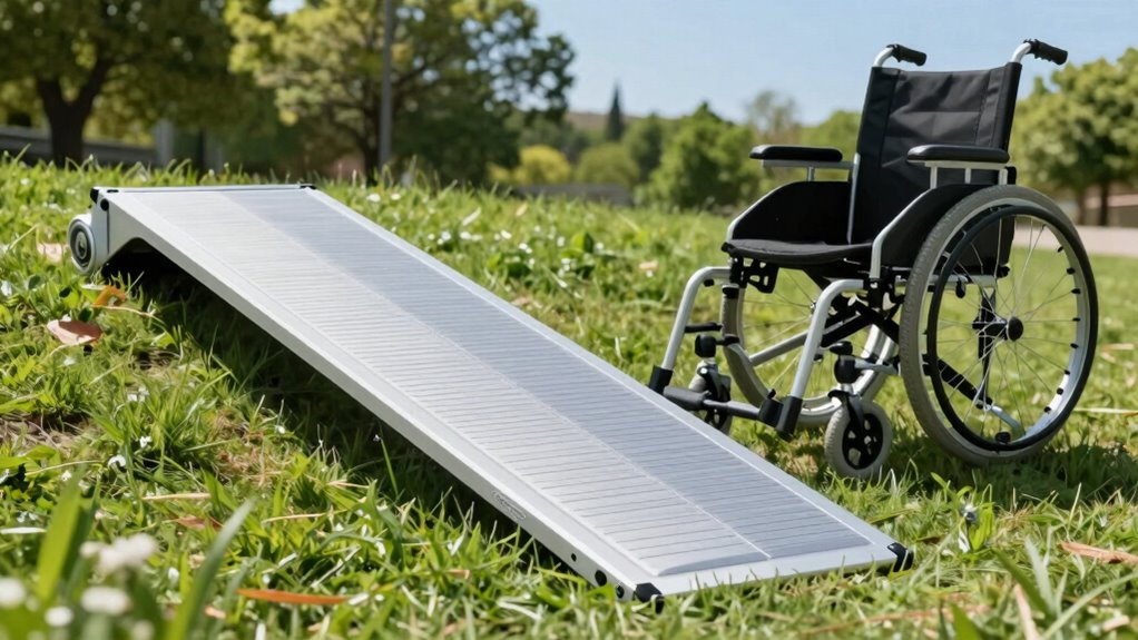 Safety features play a vital role in guaranteeing that portable wheelchair ramps provide secure and reliable access. Non-slip surfaces, whether textured or sealed, are essential for maintaining traction, especially in wet or uneven conditions. Reflective strips increase visibility, helping users and caregivers avoid accidents in low light. Extended guide rails at both ends improve stability and prevent the wheelchair from slipping off the sides. Transition plates at the top and bottom create smoother ground fitting, reducing wobbling and potential tipping. Raised side rails or anti-roll edges help contain the wheelchair within the ramp area, minimizing roll-offs. These safety features work together to guarantee confidence and security during use, making the ramp a dependable and safe mobility solution.