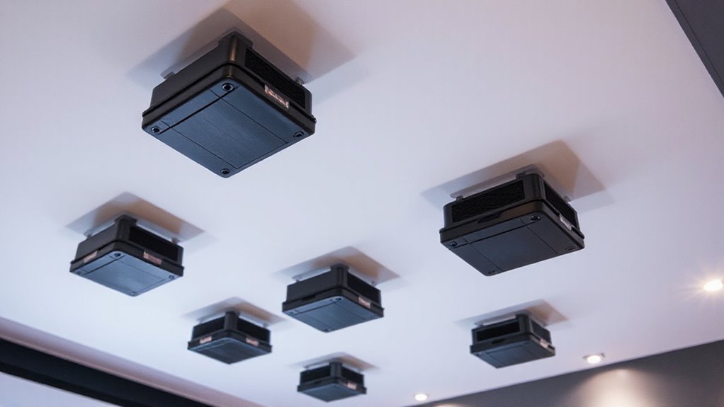 Ensuring your projector lift operates quietly is vital for maintaining a comfortable viewing environment. Most motorized lifts with electromagnetic brakes keep noise levels below 50 decibels, which minimizes disruption. The type of motor, like tubular or synchronous gear motors, also influences noise; high-quality motors are designed for quieter operation. Regular lubrication and maintenance help keep the lift smooth and silent over time. Additionally, some lifts feature integrated noise-dampening materials or sound-insulating enclosures, ideal for quiet settings like home theaters or conference rooms. The speed of the lift’s movement matters too—slower, controlled motions tend to produce less noise than rapid, jerky movements. Considering these factors guarantees you get a lift that operates quietly, preserving the integrity of your viewing experience.