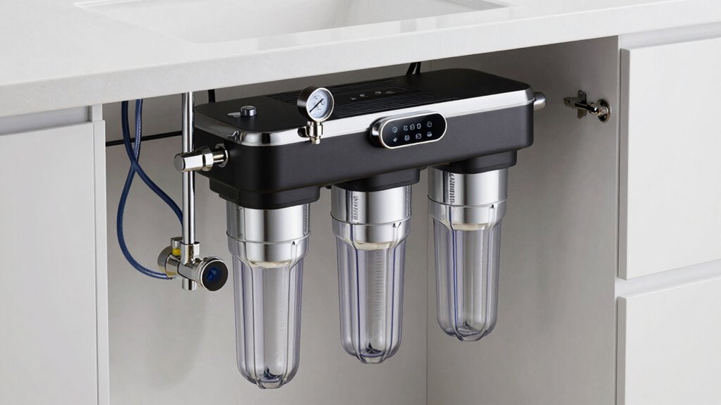 Think of my under-sink RO system as a loyal garden hose; it needs care to keep flowing smoothly. Usually, these systems last around 2 to 3 years, but that depends on usage and water quality. I check my filters regularly and replace them as recommended to guarantee fresh, clean water. Proper maintenance is key—like tending a garden—to keep my system running efficiently and extend its lifespan.