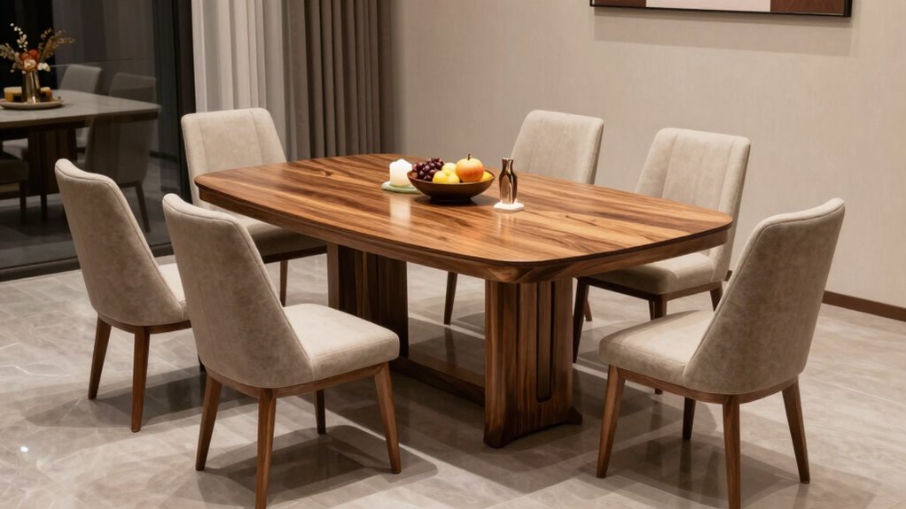Choosing a solid wood dining table set for six means paying close attention to the material’s durability and quality. High-quality woods like walnut, oak, or pine are excellent choices because they resist wear and tear over time. The density and grain pattern impact strength; denser woods tend to last longer. Construction techniques matter too—mortise and tenon joints, for example, add stability and extend the set’s lifespan. Proper finishes, such as non-toxic sealants or varnishes, protect the wood from moisture, scratches, and stains, safeguarding your investment. Regular maintenance, including gentle cleaning and avoiding extreme heat or moisture, helps preserve the wood’s integrity. Overall, selecting well-crafted, durable materials ensures your dining set remains beautiful and functional for years to come.