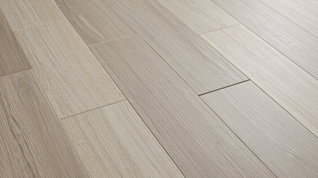 Waterproof capabilities are a essential factor to take into account because they guarantee your SPC flooring can handle moisture exposure without damage. Thanks to advanced locking and sealing technology, SPC planks create an impenetrable moisture barrier, ensuring 100% waterproof performance. The rigid core, made from limestone and stabilizers, not only boosts impact resistance but also prevents water from seeping in. This design makes SPC flooring ideal for high-humidity areas like kitchens, bathrooms, and basements. Its quick-drying surface simplifies maintenance and reduces moisture buildup, helping prevent mold and warping over time. Proper installation with precise locking mechanisms is critical to maintaining these waterproof qualities. Overall, SPC flooring’s waterproof features protect your investment and keep your space looking great for years.