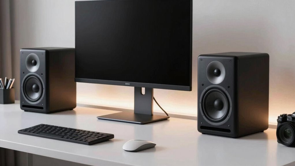 When selecting studio monitor speakers for your office, I focus on sound accuracy and clarity to guarantee your audio is crisp and true to life. I also consider connectivity options and room size to make sure the speakers fit your workspace and setup. Finally, I look at power, volume levels, and adjustable tuning to customize the sound to your preferences and environment.
