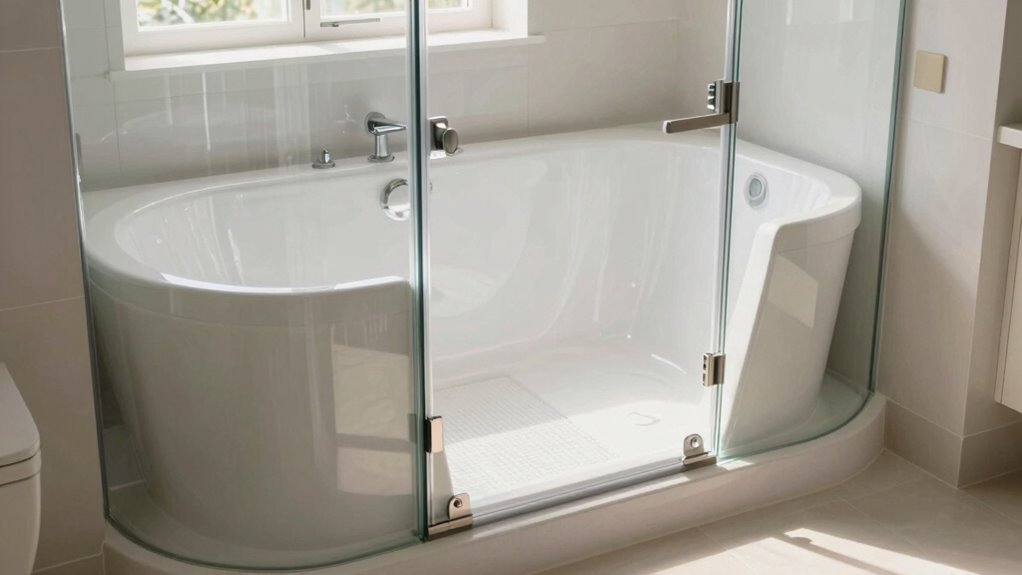 Safety features are the most critical factors to contemplate when choosing a walk-in bathtub for seniors because they directly impact daily safety and independence. Slip-resistant floors and grab bars are essential—they substantially lower the risk of falls and injuries during bathing. Low-entry thresholds, typically around 4 inches or less, make entry easier and reduce the need for strenuous steps. Wide-opening doors with secure, watertight seals help prevent spills and allow for safe, independent access. Built-in safety latches and support handles boost stability, especially for those with limited mobility or arthritis. Features like textured flooring and ergonomic seating not only enhance safety but also increase comfort. Prioritizing these safety elements ensures a safer, more confident bathing experience for seniors.