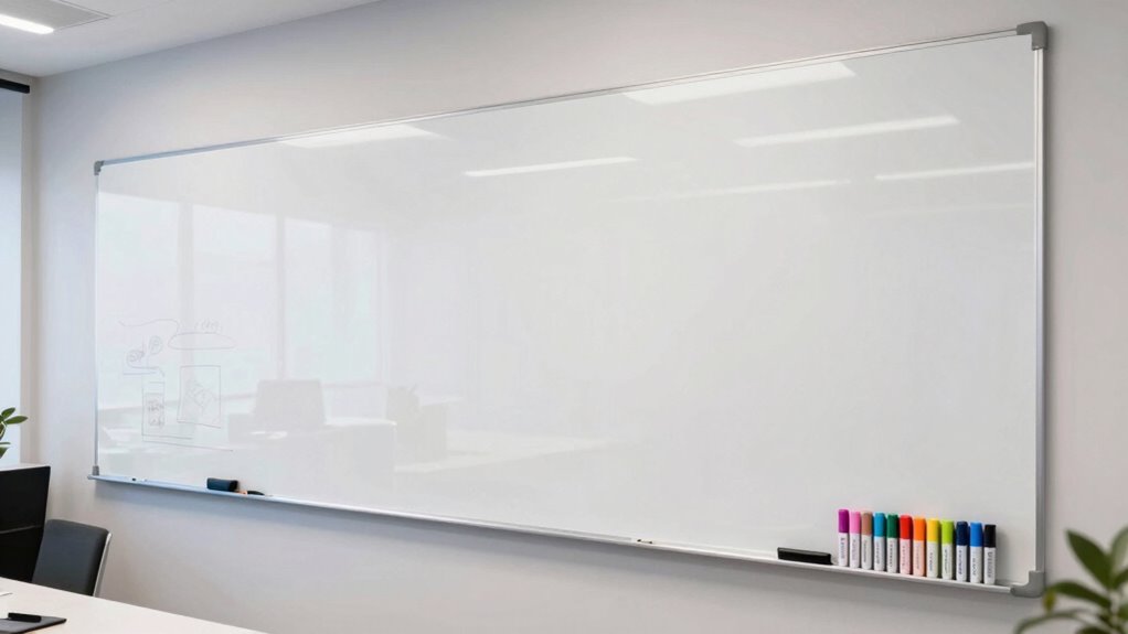 Choosing a durable whiteboard wall decal means prioritizing materials that resist scratches, stains, and ghosting. High-quality PET or thermoplastic elastomer surfaces are ideal because they’re built to withstand frequent use without degrading. The thickness of the whiteboard, often four times that of standard sheets, adds to its longevity by preventing wear and tear over time. A strong self-adhesive backing ensures it stays securely in place, reducing peeling or damage. Proper surface preparation, like cleaning and ensuring a smooth, dry area, is essential for maximum adhesion. Regular maintenance with suitable whiteboard cleaners and avoiding abrasive tools help keep the surface clear and in good condition. Investing in a decal with these features guarantees it’ll last through years of use.