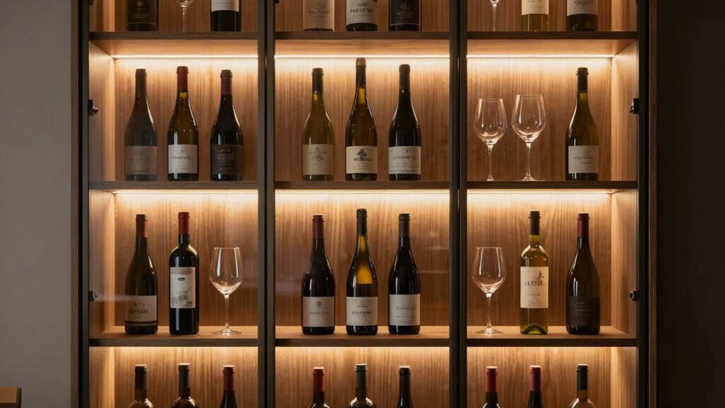 LED lights don’t negatively affect wine preservation over time when used properly. I’ve found that they emit minimal heat and UV radiation, which are the main risks to wine quality. As long as the lights are designed for wine cabinets, they won’t alter the wine’s taste or aging process. I recommend choosing LED-lit cabinets with UV filters for ideal preservation and a stylish display.